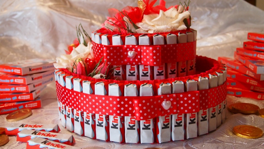 With cakes, everything is much easier. Choose your favorite birthday chocolates, make a cake out of them, sticking to the base in a circle around the wrappers. It can be in several tiers, each tier of different sweets. Then pack the finished product in transparent paper and tie a beautiful bow. You can make the so-called sweet poster. Here the names of sweets and chocolate are used as a continuation of the phrase.