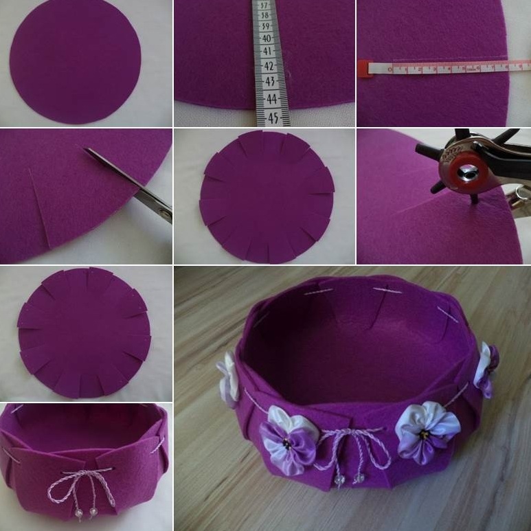 First you need to decide on the height of the sides. The larger the piece of felt, the higher the sides can be made and the deeper the product. Cut a square from the fabric of the desired size. Then outline where the holes will be to bond the sides to each other. To do this, fold the felt in half to make a triangle and make symmetrical marks on both sides of the same angle.