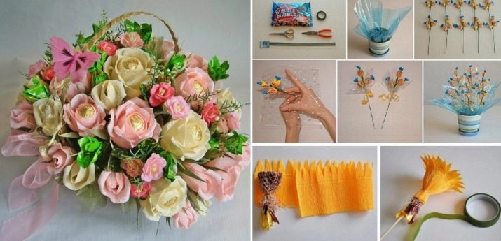Sweet gifts include bouquets of sweets. This bouquet is easy to make yourself. To do this, we need double-sided tape, wire, corrugated wrapping floral paper, cloth. Make a cup of corrugations for each candy, wire wrap double-sided tape, then paper. Cut the squares from the fabric, fold them in half and wrap each flower, tied at the base with a suitable ribbon.