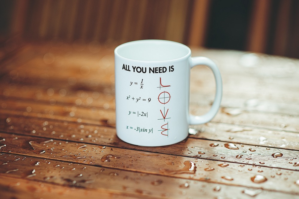 A mug with formulas would be appropriate for a teacher of mathematics, physics, and chemistry.