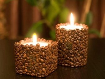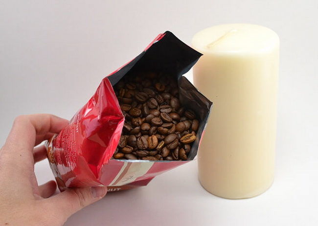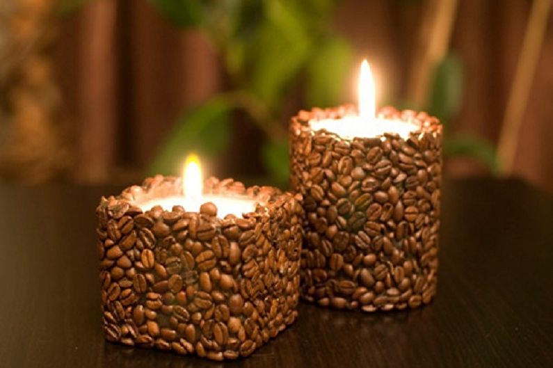 To make a decorative candle with your own hands, you need to prepare two wax candles, a couple of small boxes and coffee beans. You can learn in advance the preferred smell and buy candles with the scent of lavender, mint or lemon. In a water bath, you should melt the candles, put a small box in a large one and pour coffee in the gap between the walls, then pour them with wax.