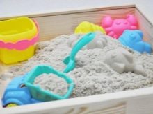 A rather unusual, but at the same time useful gift sandboxwith which the girl can play all year round. Today, various options for bulk materials are abundant, including kinetic sand, with which the crumb will develop and have fun at home.