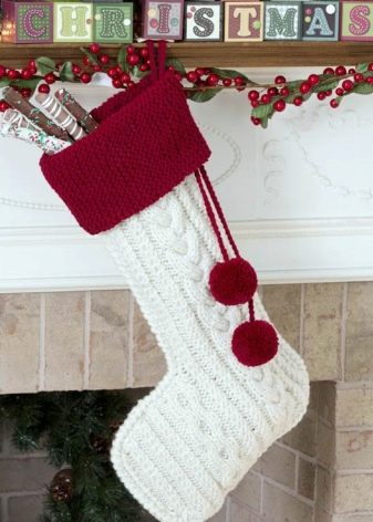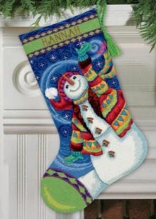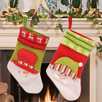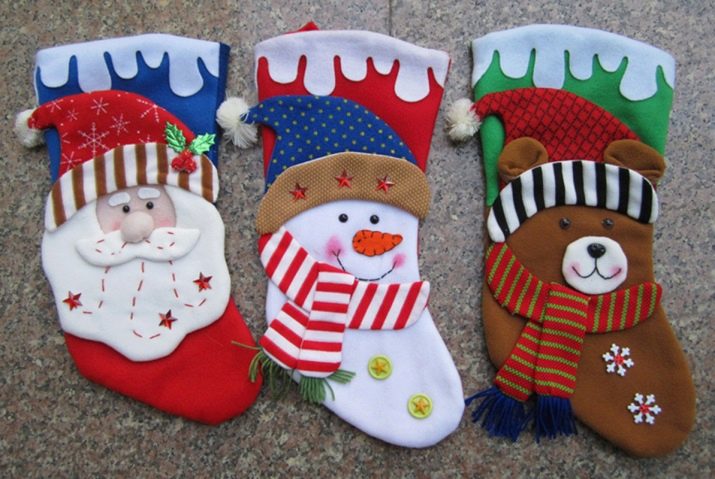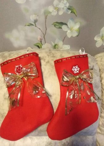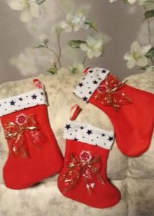 There are many types of Christmas socks design. As a decoration option, you can even use stockings or ordinary felt boots (this improvised sock will look very original). It is possible to arrange such an unusual storage for gifts in the form of Santa Claus and Snow Maiden boots in the appropriate style: paint snowflakes with paints on the fabric (or sew them with threads), embroider with beads and sequins. A fringe to make faux fur or swan fluff.