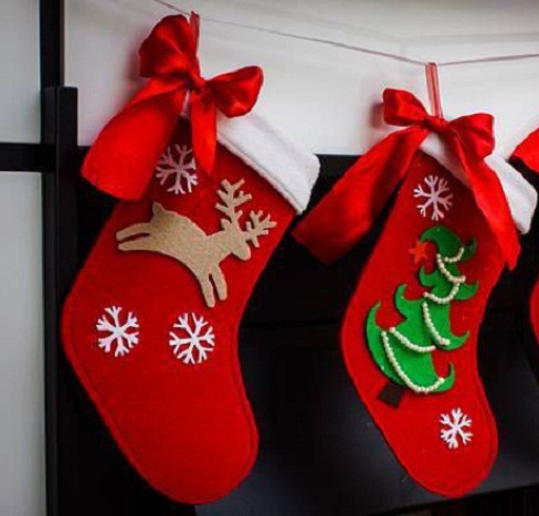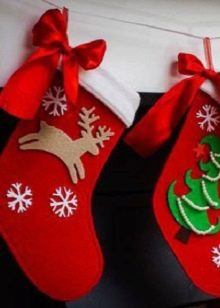 Socks made of felt is quite simple, and they will look very impressive. Plus the choice of this material is also due to the fact that due to its density, the accessory keeps its shape well and will last for a long time, and the decor can be cut off at will and changed to a new one with the onset of next year. For the manufacture of a felt product, you only need to cut 2 identical parts of a sock and sew the halves together using a sewing machine or even manually.
