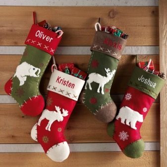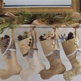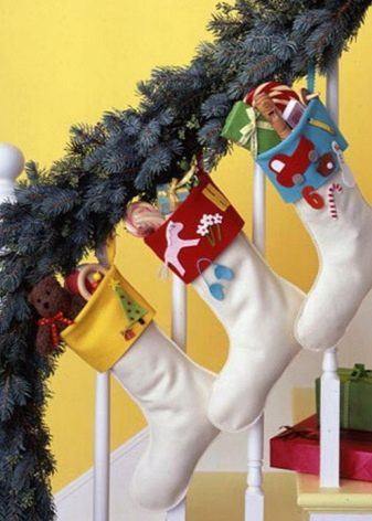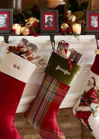 The decor may also differ from the concept of placing socks and the one to whom you are going to make presents in such an original way. An interesting idea for a large family will be making several socks of different sizes (each will have its own). And you like the way you like to make the inscriptions "beloved dad", "golden child", "caring grandmother" or write the names of loved ones, on each sock, and even wishes.