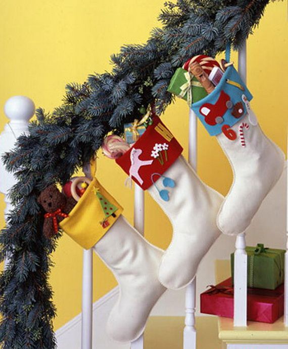 Usually Christmas socks are placed above the fireplace, but you can think of another place for them. For example, using a cord, you can make an improvised garland of socks and hang over the bed, on the door, on the railing of the stairs, and even decorate a New Year tree with them. Great look Christmas wreaths, decorated with embroidered socks as a decor. If you use felt boots, as an element of decoration, you can put them under the Christmas tree.