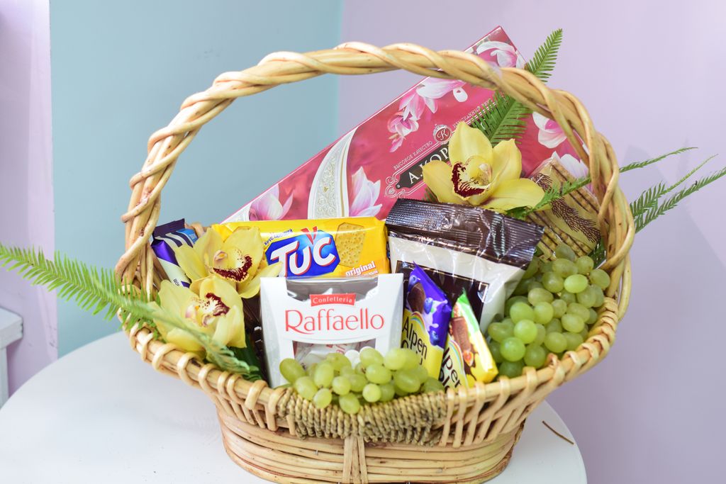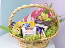 From food you can donate a basket with exotic fruits, a jar of red or black caviar, a bottle of wine or champagne, and, of course, a sweet gift. As practice shows, older people rejoice in sweets in a beautiful package more than children and are very pleased with this gift.