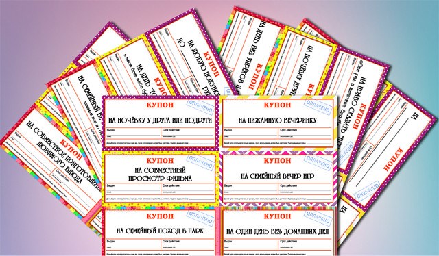 - Coupons. Make yourself a layout and print a lot of different coupons, for example, “Massage coupon”, “Coupon that the guy washes the dishes”, “Coupon 10 kisses” and other possible options. The girl can use each coupon once.
