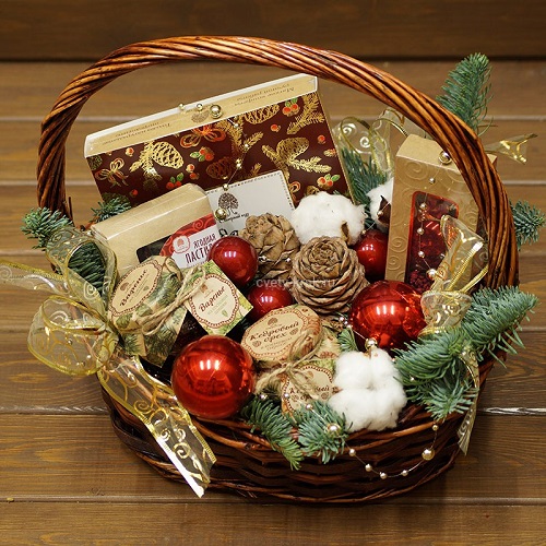 - Christmas sweets basket. Sweet love not only children, but also adult men. In the end, this is a standard and almost win-win sign of attention, which is appropriate to show in any situation. If your father-in-law is an ardent opponent of glucose, then instead of sweets you can put meat and sausages in a basket.