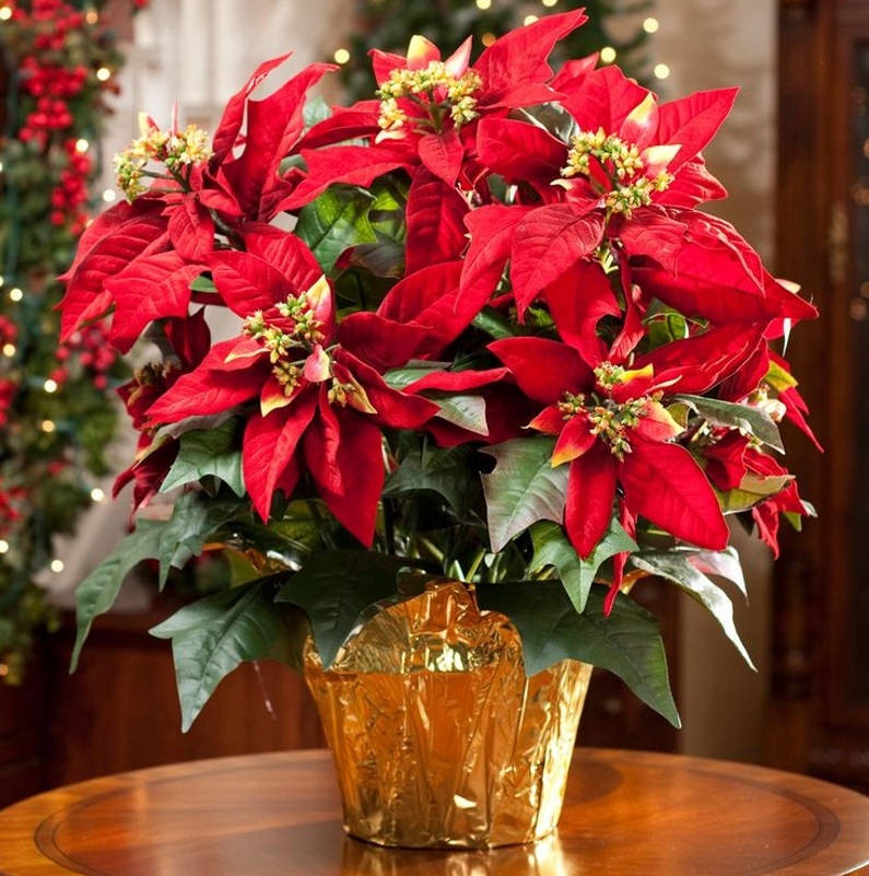 - Potted, in elegant pots. Especially appropriate to give New Year's poinsettia. Another name for this plant is “Christmas Star”, which bears a flower for its beautiful purple leaves. It is presented not only in the form of a room flower, but also in a bouquet, one of the elements of a New Year's composition, in a Christmas wreath or a garland.