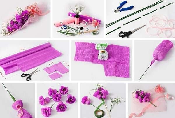 - A gift of flowers made of candy and corrugated paper will be appropriate for any occasion. These can be gorgeous orchids or a modest bouquet of tulips. Combining the most popular attributes of the holiday, flowers and sweets, you will present an original gift. It is completely easy to make them from lush bows, decorative elements, paper and favorite sweets.