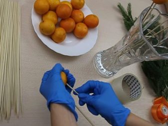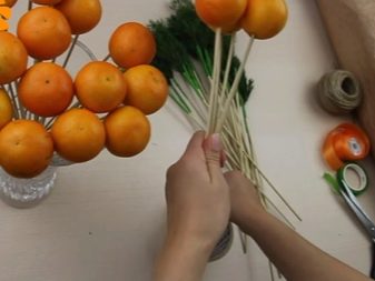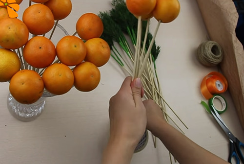 Attach coniferous branches to wooden skewers using transparent tape. Connect 3 wooden skewers at the base with scotch tape, and fasten the mandarins on top. Do the same with the remaining mandarins and coniferous branches, and then carefully combine all the elements for the base of wooden skewers into a single composition. Securely fix the base with scotch tape so that the skewers fit snugly together and do not break up.