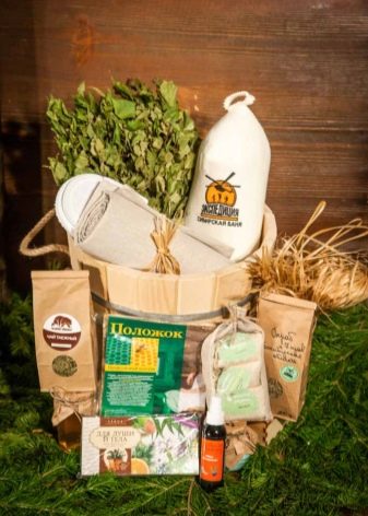 This set may include brooms for a steam room, hats, mittens, slippers, essential oils - all that is necessary for a comfortable rest in the bath and sauna.