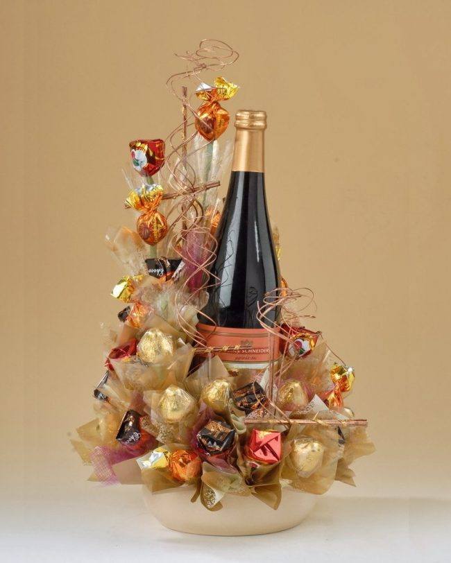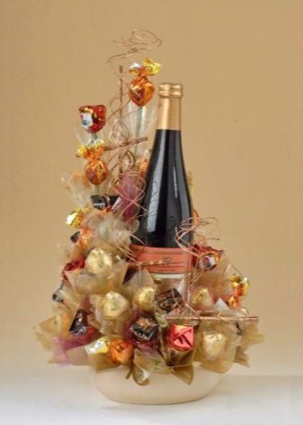 The easiest option is to present a bottle of alcohol in the form of a pineapple or a Christmas tree. To do this, you need to glue the bottle with double-sided tape, and gently close the sticky side with candy or tinsel. Such a gift will undoubtedly become an original decoration of the holiday table.