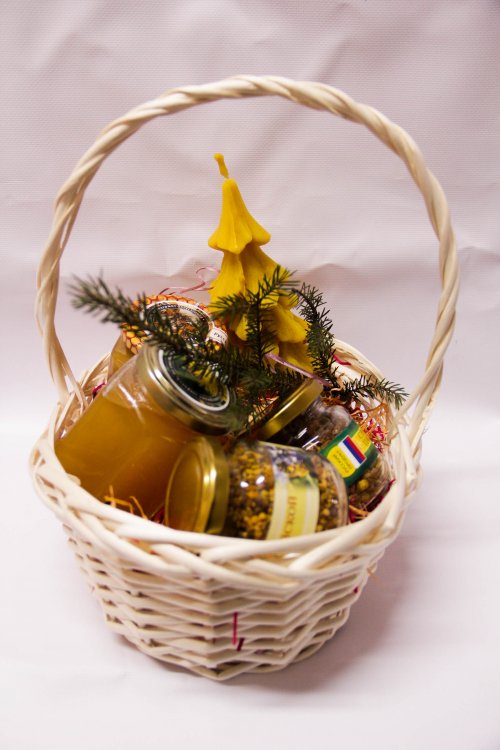 A gift basket with jam and honey will be a useful gift for a sweet tooth. You can assemble and arrange a set in the New Year's style yourself.To do this, you only need to buy natural sweets or cook yourself, packaged in beautiful jars and supplemented with beautiful labels.