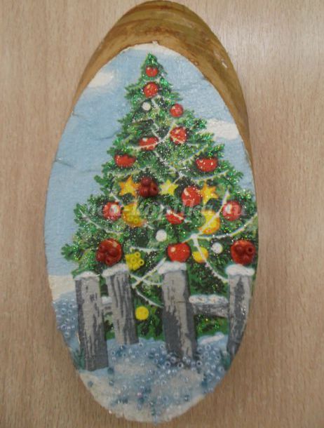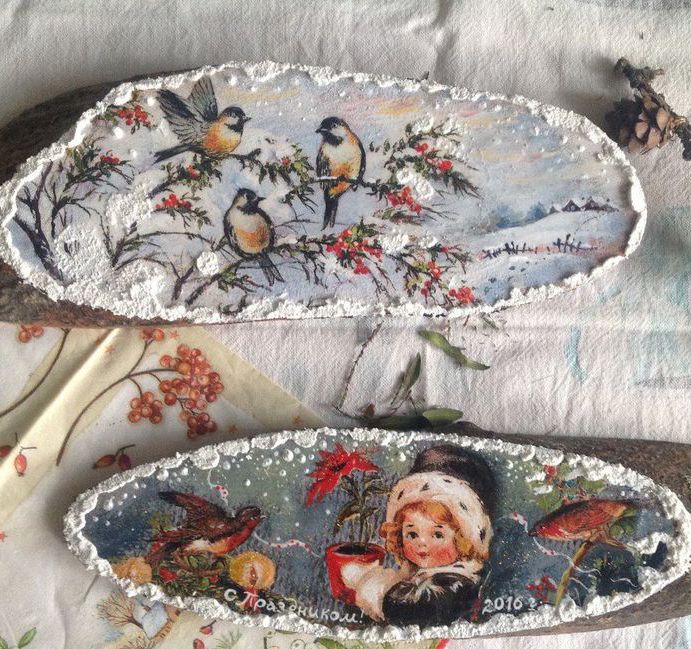 Today the painting of a wooden cut is very fashionable. Moreover, he can even master this art, whose visual skills are very modest. You can take 3 of these neat cuts, draw consonant plots on them (as a basis you can take a series of Soviet New Year cards). As a seasonal interior decoration - perfect. With taste, quite original and, of course, sincere.