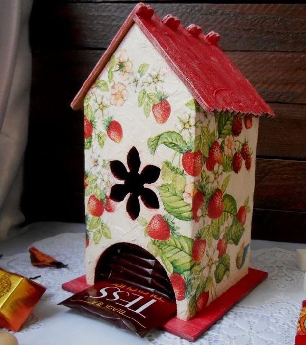 During the winter holidays, tea is often given, because it warms and raises the tone, which is important during the cold season. Therefore, decorating a tea house using decoupage technique is an interesting idea. You need to purchase a standard wooden blank, and the motifs can be found on the napkins of the New Year series or on the Internet.