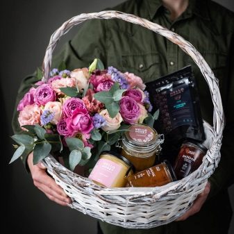 - Food basket. Food bouquets are now considered very fashionable and original. Such a bouquet can be collected independently, and you can order. They are suitable for both women and men (depending on what to fill). In the composition of the bouquet using fruits, vegetables, cheeses, sausages, dried fish, drinks. You can find different colors of packaging for a bouquet in a feminine or masculine style. This option of gratitude may appeal to both the attending physician and the nurse who helped him.