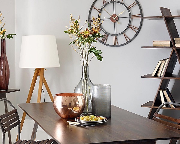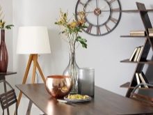 If the interior is made in a modern style, for example, hi-tech, then you can look at the beautiful metal wall clock, glass vases of unusual shapes and candlesticks, made in a futuristic direction.