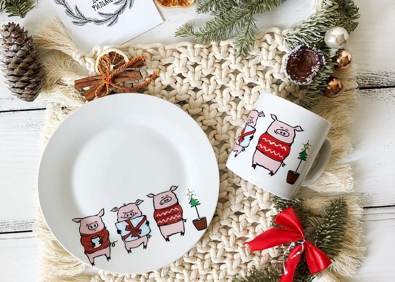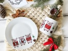 You can give a child set of dishes, which is made in the Christmas theme. The baby will have a personal plate, cup and cutlery. For the little ones, you can also buy a bib.