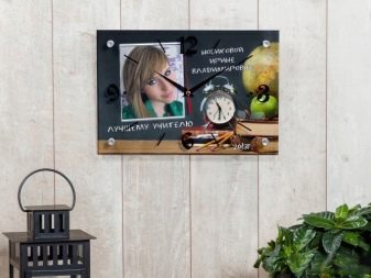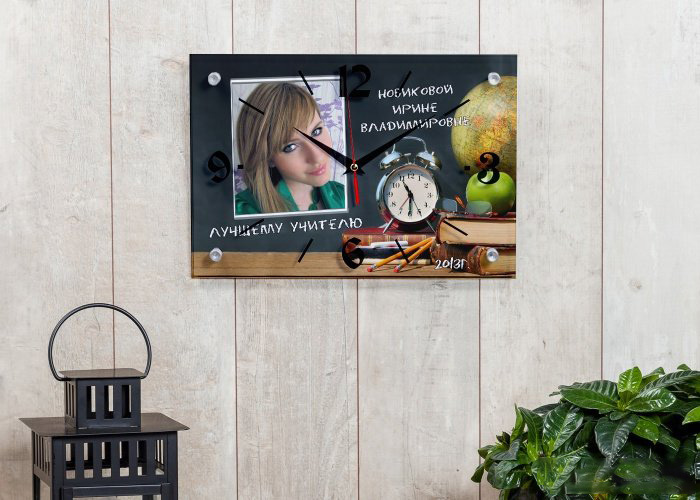 Wall Clock. This can be either a finished product on school subjects, or made to order, with a portrait of a teacher, for example, or of the whole class. Such hours will perfectly fit into the interior of the classroom and will remind the teacher about the class for a long time even after the children grow up and leave the walls of the school.