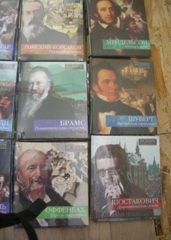Music teacher - Notebooks, a set of discs with a collection of classical music, a bright illustrated encyclopedia describing the biography and creative way of world composers.