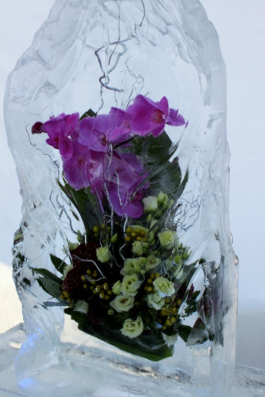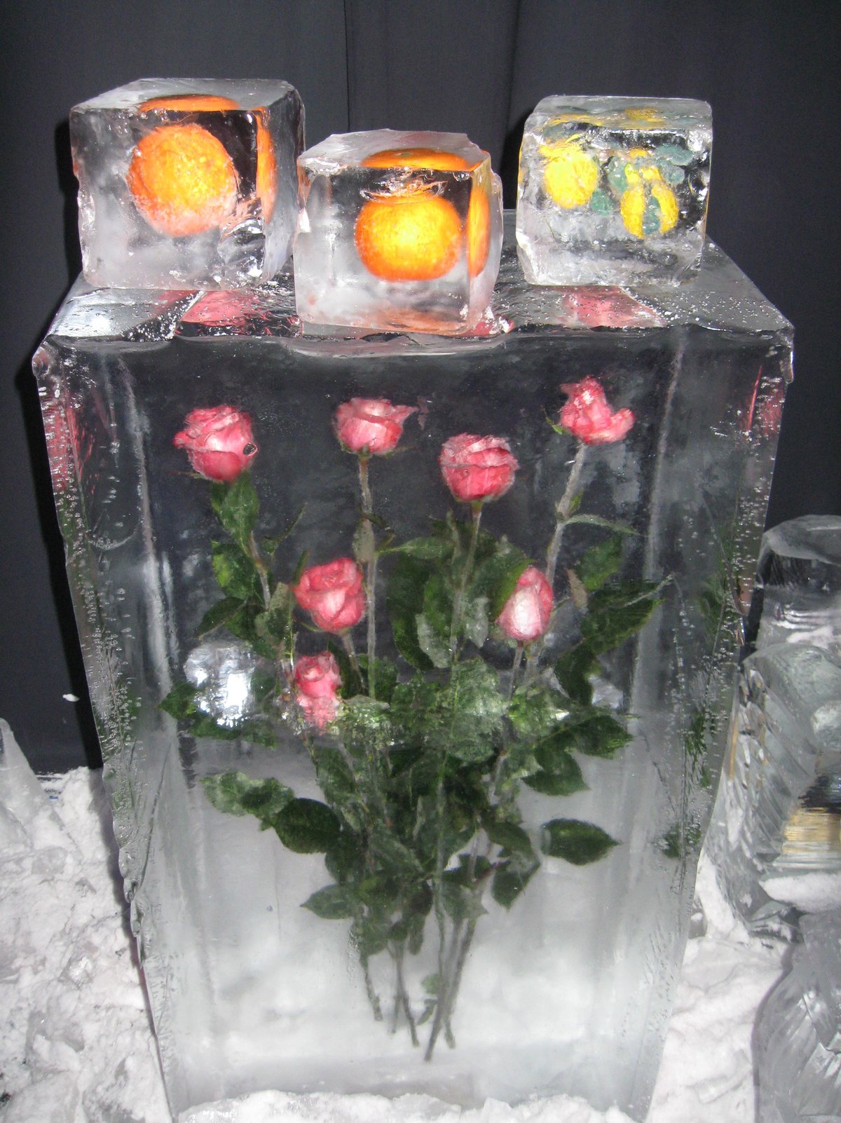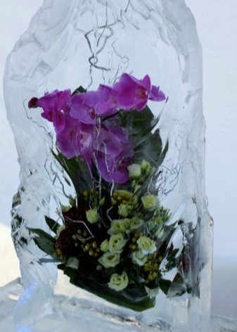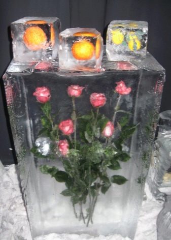 - Flowers in the ice. Such a gift can be purchased in specialized stores or try to make yourself, but in this case, an excellent result is not guaranteed. The sight of a rose in an ice cube is, of course, an amateur sight, but some like it.