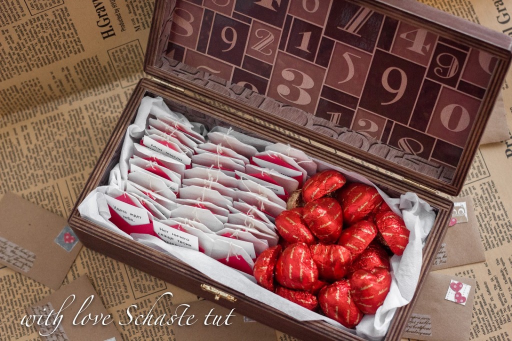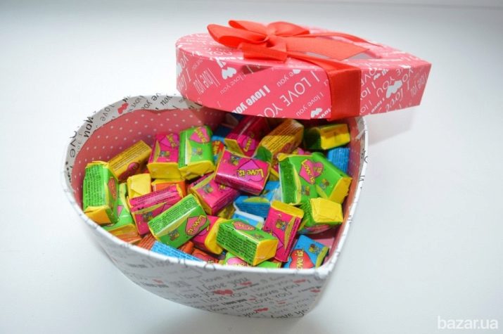 - Box of chewing gum "Love is ...". Romantic natures will appreciate the box of chewing gums, which are completed with a piece of paper describing love. You can give them in the original packaging, and you can arrange in a gift box.