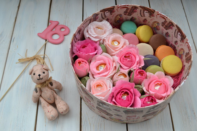 Every woman is not indifferent to sweets, so she will be glad to receive a box with various goodies as a surprise. A box of chocolates is trite. It is better to buy a beautiful and roomy box in the form of a heart and fill it yourself. Filling can be anything. These can be French macaroons, eclairs, muffins or cupcakes.