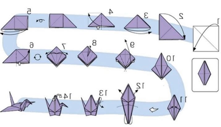 - slightly pull out the former tops of the rhombus, and bend one of them forward - this is the head of a crane; pull the wings with your hands - they should unfold;