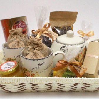 Often such baskets are thematic. For example, the basis of the composition is a new set of dishes, and kitchen towels, napkins and similar items act as a supplement to it. However, you can use any other method of picking the box (for example, in color, when all donated items must correspond to a certain shade).