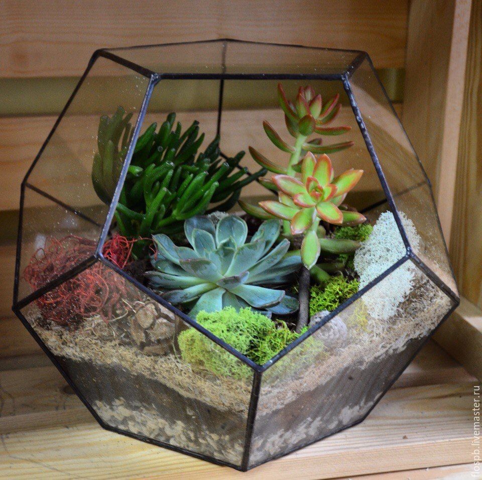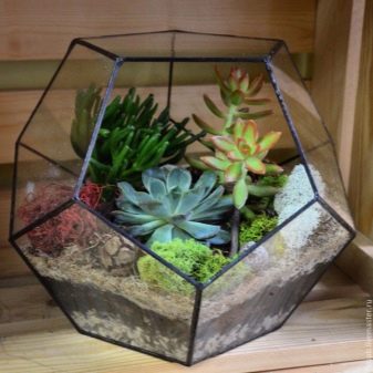 Florarium - another version of gardening cabinet. Exotic plants in the original vase in the form of a sphere or a cube will surely please a young woman in a high position. The idea is original, fresh and modern.