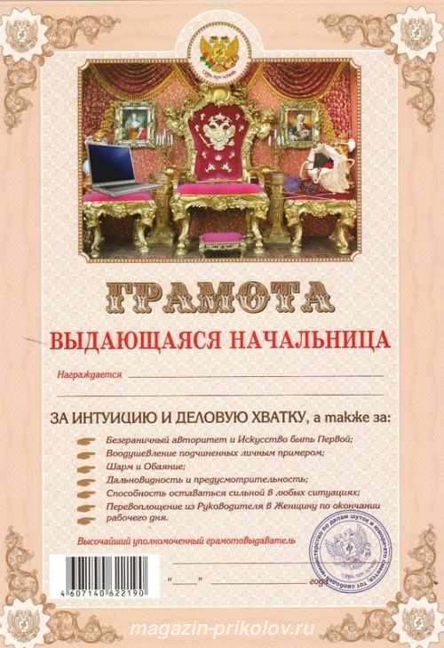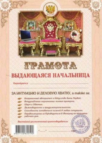 If your leader communicates with subordinates in a simple way, you can surprise her with your creativity. For example, you can do it yourself in a graphic editor. funny letter or give a certificate for 1 hour of overtime work of the whole team.