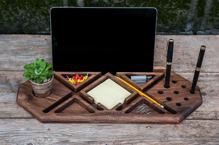 A natural wood organizer is an excellent gift for those who spend most of their time at their desk in the office and respect the environment. It is quite possible to choose the necessary accessories for this eco-gift. For example, this is a set of pencils and pens, which are made from the same natural material.