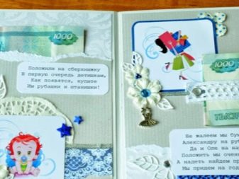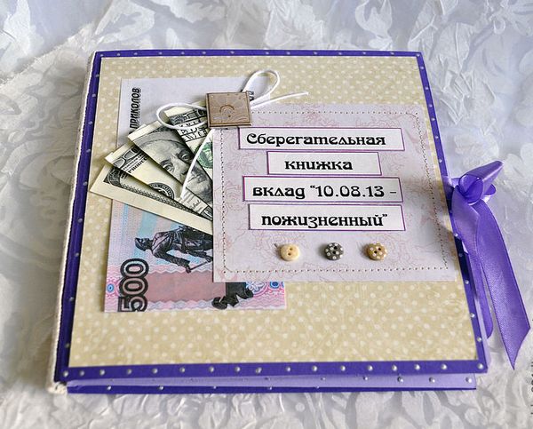 In the folder you need to make a pocket for investing money. The most important thing in a gift is congratulations and wishes, thought up personally. You can decorate such beauty with lace, pearls, rhinestones.