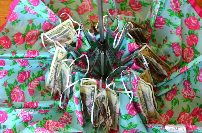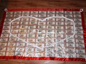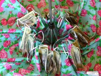 In an unusual way, hand money with an umbrella. To do this, you need to take the strings, attach each bill and tie them to the umbrella spokes. When the umbrella opens, the cash will hang beautifully down.
