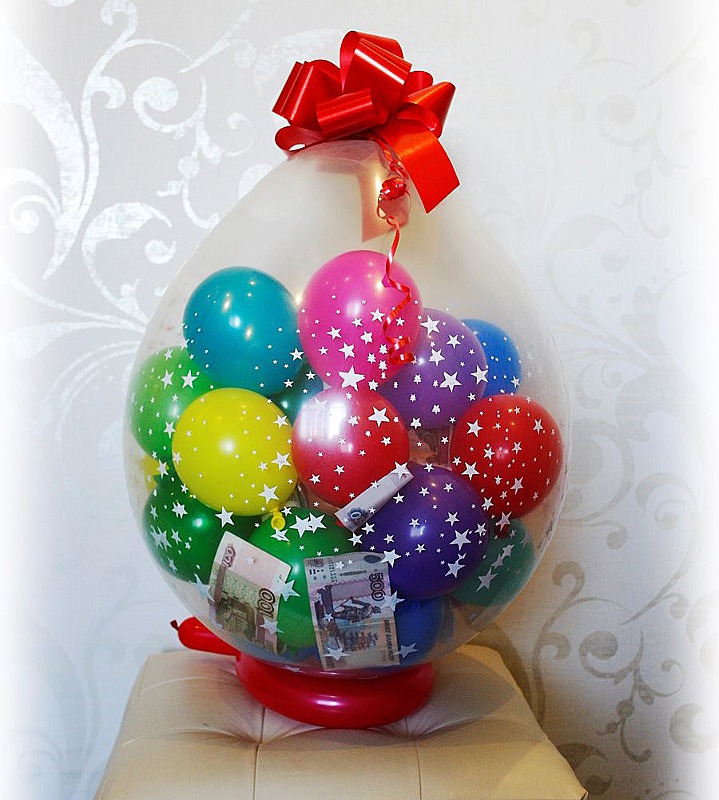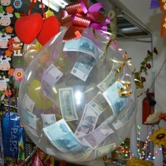 You can give money in an interesting way, for example, by investing them in balloons. To do this, inflate the balls and hide the bills there by folding them into a tube and securing them with tape.