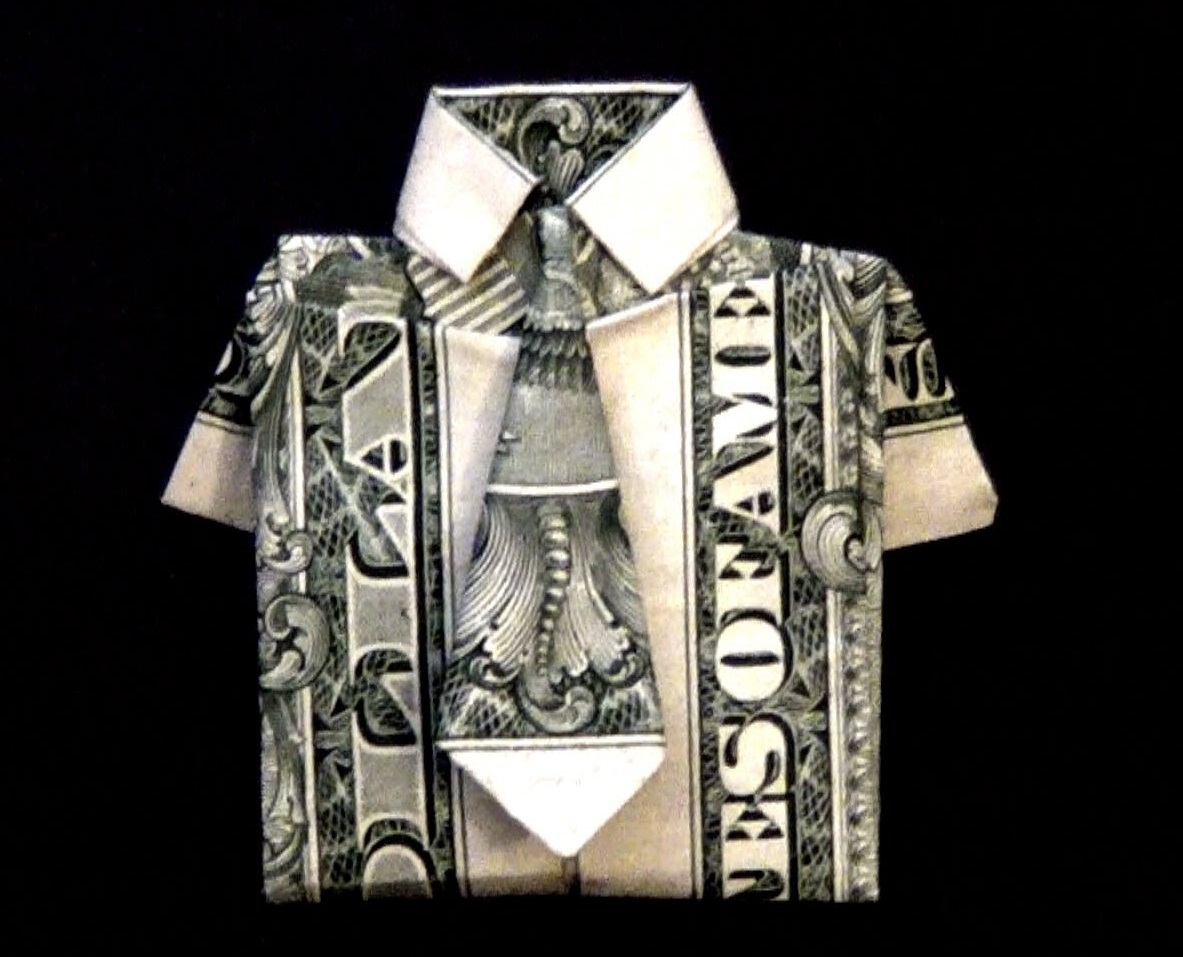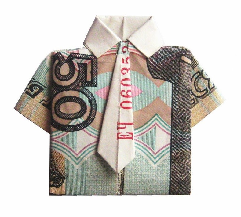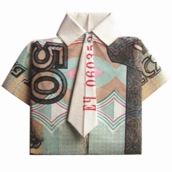 Cute and funny gift will be in the form of a shirt with a tie from a banknote. For the manufacture will need only one bill. Manufacturing techniques are as follows.