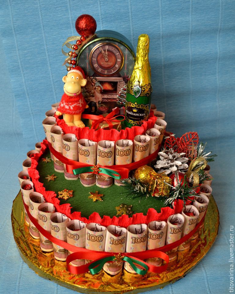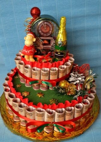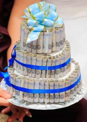 A worthy money cake will be a birthday present. For this you will need: cardboard, paper clips, money, glue, ribbon decorations. Here is a cake making technique.