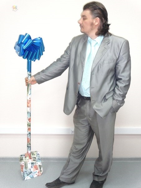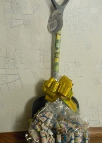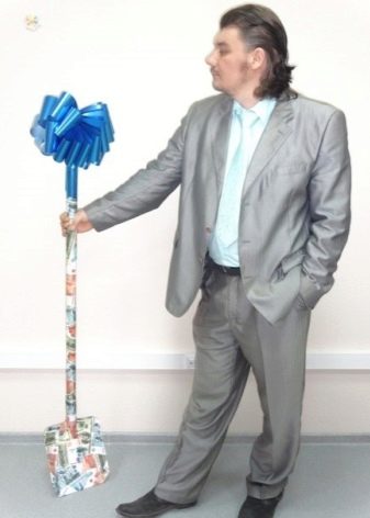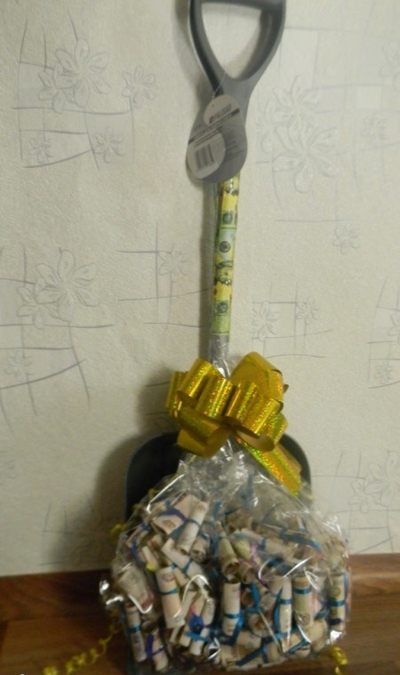 Make a ridiculous money shovel, as in the saying “Row money with a shovel”. It is simply necessary to glue the pocket on the shovel, in which you can put the appropriate banknotes so that they can be seen from the pocket.