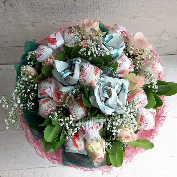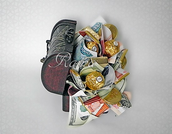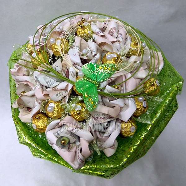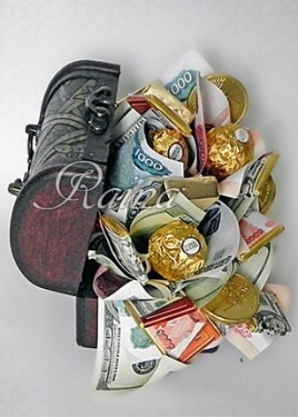Such a gift will be original and appetizing. To do this, buy a round candy in a beautiful wrapper. Make a few money roses, as described above, but it is advisable to fold the buds is not very much to fit sweetness.