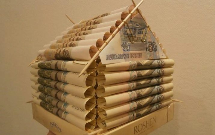 Make a hut out of money. They must first be ironed and then rolled up into tubes and fastened with clips. Then you need to fasten the tubes together to make a house (you can also use paper clips). Walls to connect with skewers. Skewers with a house inserted into the foam. The house is ready.