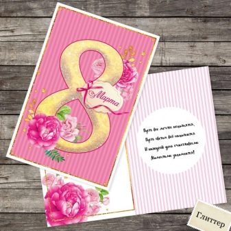 You can easily find thematic postcards in the bookstore, but you can also make them with your own hands - colleagues will appreciate your individual approach and the effort expended. If there are no such craftsmen in the team, then you can turn to printing, where you will be printed postcards according to your sketches. This will also be a good option. True, the cost may increase.