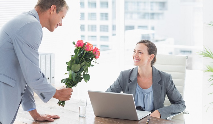 The first employee comes up to the girl in the morning and gives her a flower, the second a little later a beautiful card, the third chocolate or candy, the fourth just brings her favorite coffee from the nearest coffee shop (or from a vending machine, if there is one).