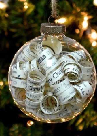 As an original gift for the New Year holidays, you can present an unusual Christmas-tree ball. Today you can easily find a transparent ball, which is made of plastic. Anything can be put inside such a ball. For example, these are chocolate dragees in bright glaze, nuts in sugar or little notes with warm wishes.