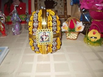 A sweet gift may consist of sweets repeating the shape of an Easter cake. An Easter egg wrapped in festive paper can also be made from a variety of candies.