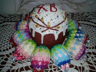 In addition to sewing, beautiful Easter gifts can be knitted or crocheted. Even with minimal experience with yarn, you can make a knitted cake. To do this, you should tie a strip of yarn of the color you like, cover it with a cut from a plastic bottle or make a frame from cardboard. Glazed top can be made of white fabric, cutting out a wavy edge in it, as an ornament you should use multi-colored beads.