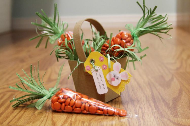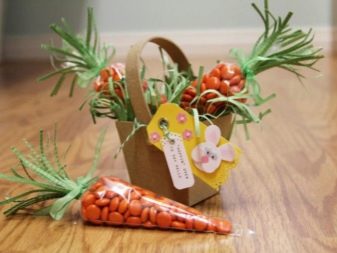 Thematic gift for Easter will be orange "carrots", which will symbolize the favorite food of the Easter Bunny. These sets are packaged in polyethylene lozenges or marmalade in an orange wrapper in the form of a root, with a green braid on one side.