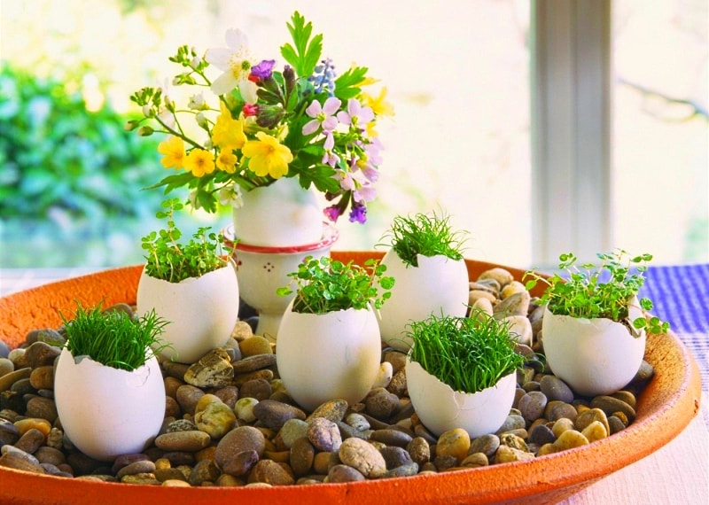 You can pass on the Easter mood and celebrate the arrival of spring by combining the two main attributes of these moments - eggs and flowers. From the shell, you can create original "pots" in which you can place fresh flowers or make bouquets of paper. In this case, the use of painted or white eggs is allowed, bringing them together in a small basket. As the middle of the flower buds can act round candy.
