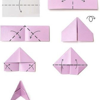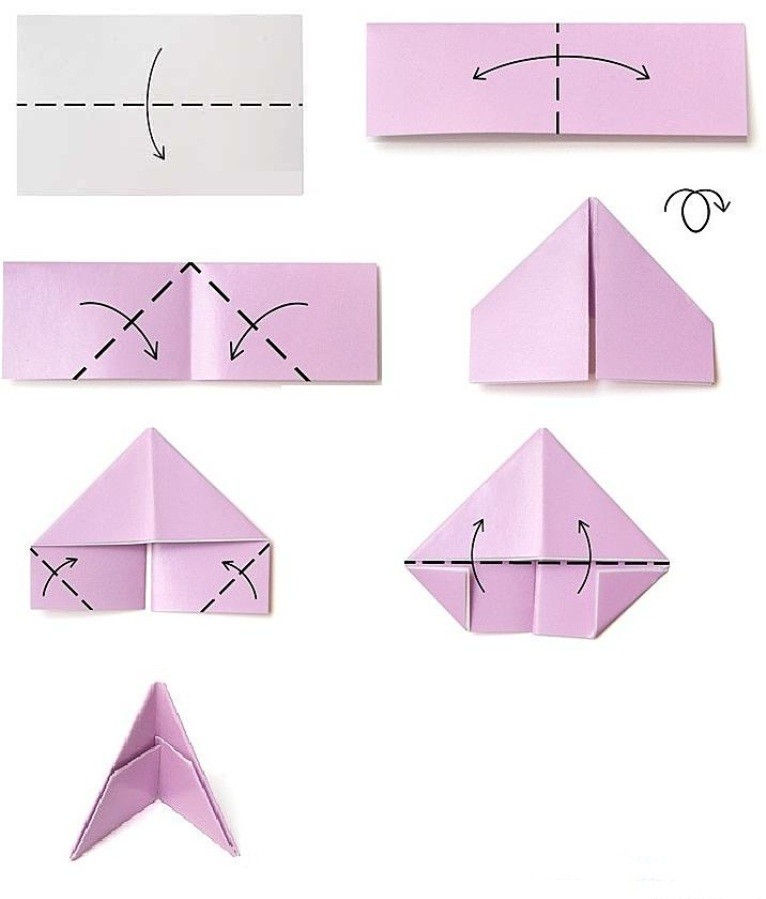 Modularly origami has recently gained a lot of popularity. And this is not surprising, since small elements are not difficult to fold. And large figures are also quite easy to obtain, having assembled them from small modules, as a designer. Modules come in different shapes, but most often they use triangular ones. They can be folded in several ways. Let us analyze the scheme of the triangular module.